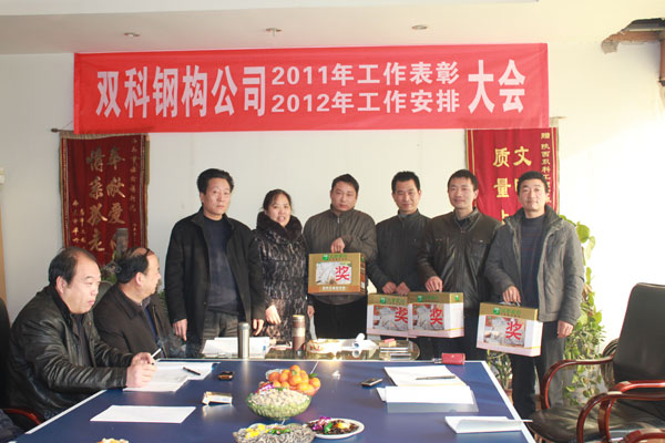 2012年2月3日,陜西雙科金屬結構有限公司召開了2011年總結表彰暨2012年工作安排大會,會議上由總經理張雙科同志對公司2011年各項工作作總結報告,對存在的問題進行了總結分析,并提出改進意見,對在工作崗位上做出突出貢獻的員工進行表彰。并對公司2012年發展方向制定了方針目標,對各部門工作做出了具體安排。