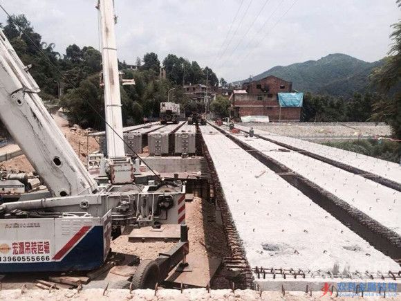 昨日,S302線溪潭橋現場熱火朝天,最后一片25米長、近60噸重的T梁在兩架吊車的懸吊下,經過10分鐘緊張的檢查、測量、安放,平穩地放到了蓋梁上面,標志著溪潭橋T梁吊裝完成。據悉,S302線溪潭橋橋位于福安市溪潭鎮境內,2013年經過省市專家鑒定為四類危橋。福安有關部門于2014年底對該橋進行拆除重建。重建后該橋全長87.08米,計劃總投資561萬元,預計7月份全面完工。
